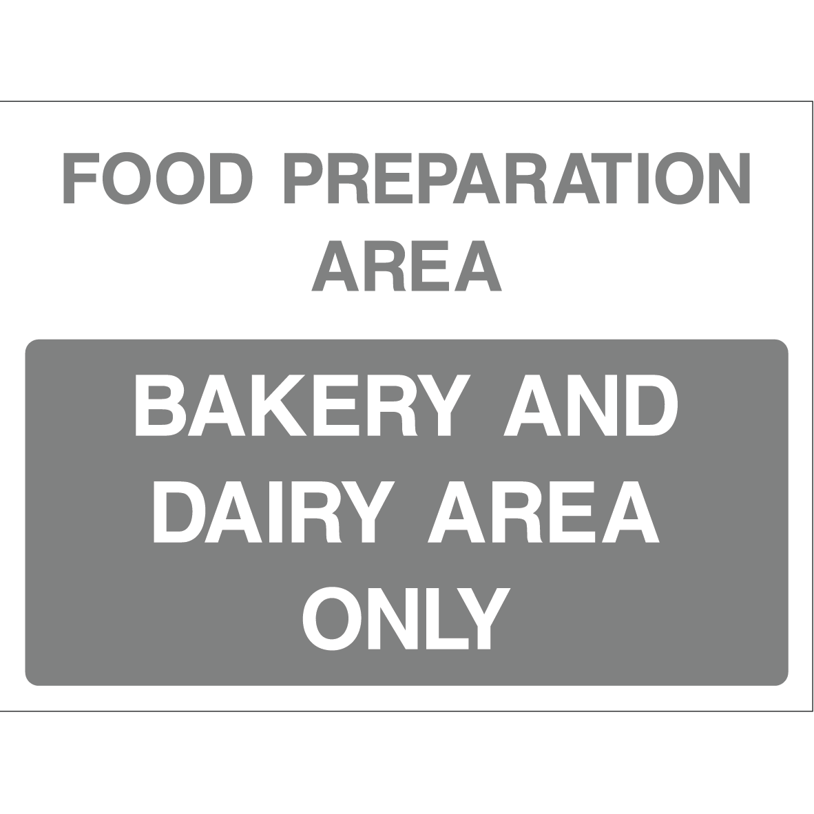 The “BAKERY AND DAIRY AREA ONLY” safety sign is an essential visual indicator for kitchens, bakeries, or storage zones where bakery and dairy products are prepared or stored. The sign features bold, white uppercase text on a dark grey background that states: