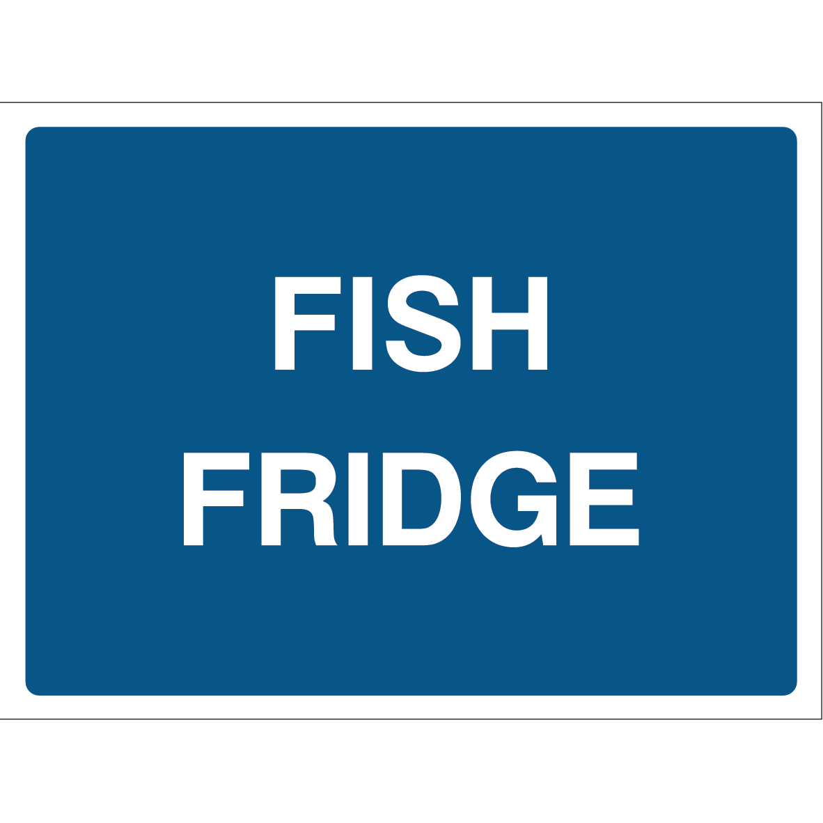The “FISH FRIDGE” safety sign is an essential visual marker for kitchens, fish storage areas, or food factories where fish is stored or prepared. The sign features bold, white uppercase text stating: