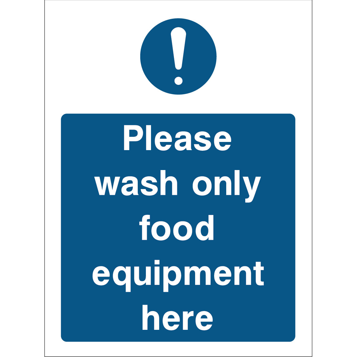The “Please wash only food equipment here” safety sign is an important visual instruction designed for environments where food safety and cleanliness are priorities. The sign features a prominent exclamation mark icon inside a blue circle at the top, indicating caution. Below, a blue rectangular background displays bold white text: