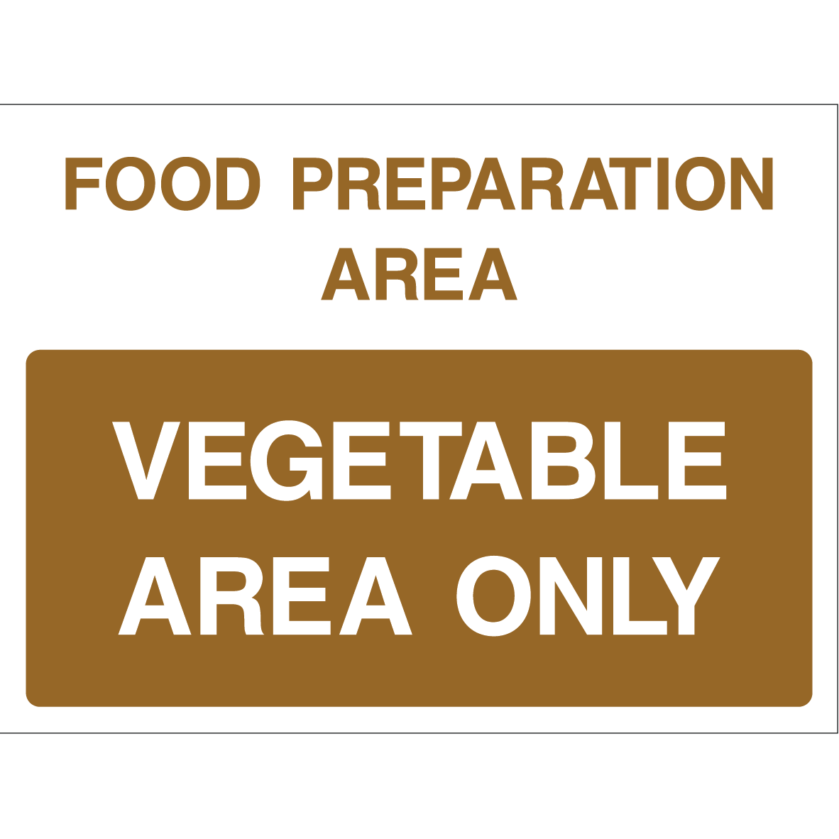 The “Vegetable Area Only” safety sign is an essential visual indicator for kitchens, food factories, or storage zones where vegetables are prepared or stored. The sign features large, bold white text on a brown background stating: