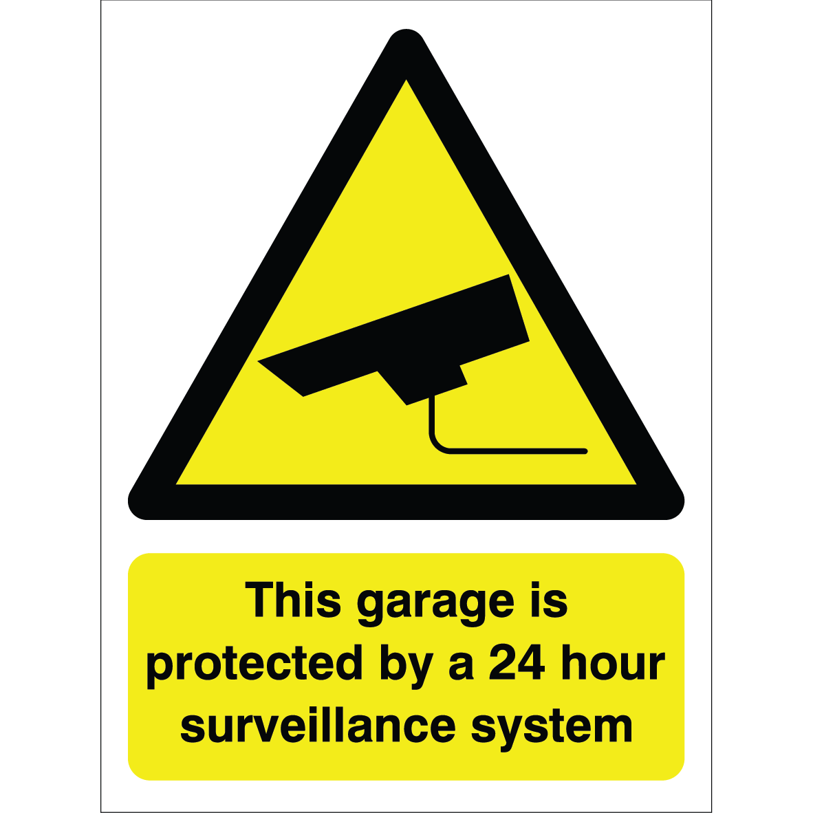 A highly visible outdoor sign with a yellow background and black text, stating “This garage is protected by a 24 hour surveillance system”.