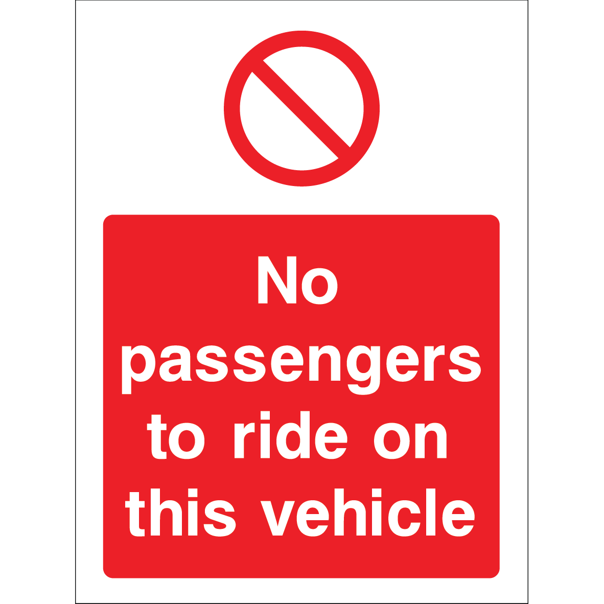 This “No passengers to ride on this vehicle” sign features a striking red background with large white text stating “No passengers to ride on this vehicle”. At the top, a universally recognised no passengers symbol (a person sitting crossed out within a red circle) visually reinforces the message, ensuring immediate recognition even from a distance.