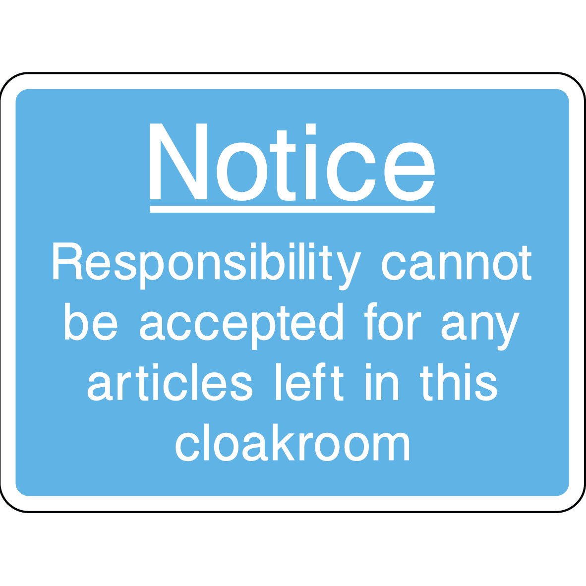 The “Notice: Responsibility cannot be accepted for any articles left in this cloakroom” sign is designed to clearly communicate that the facility is not liable for any items left behind. The sign features the message: