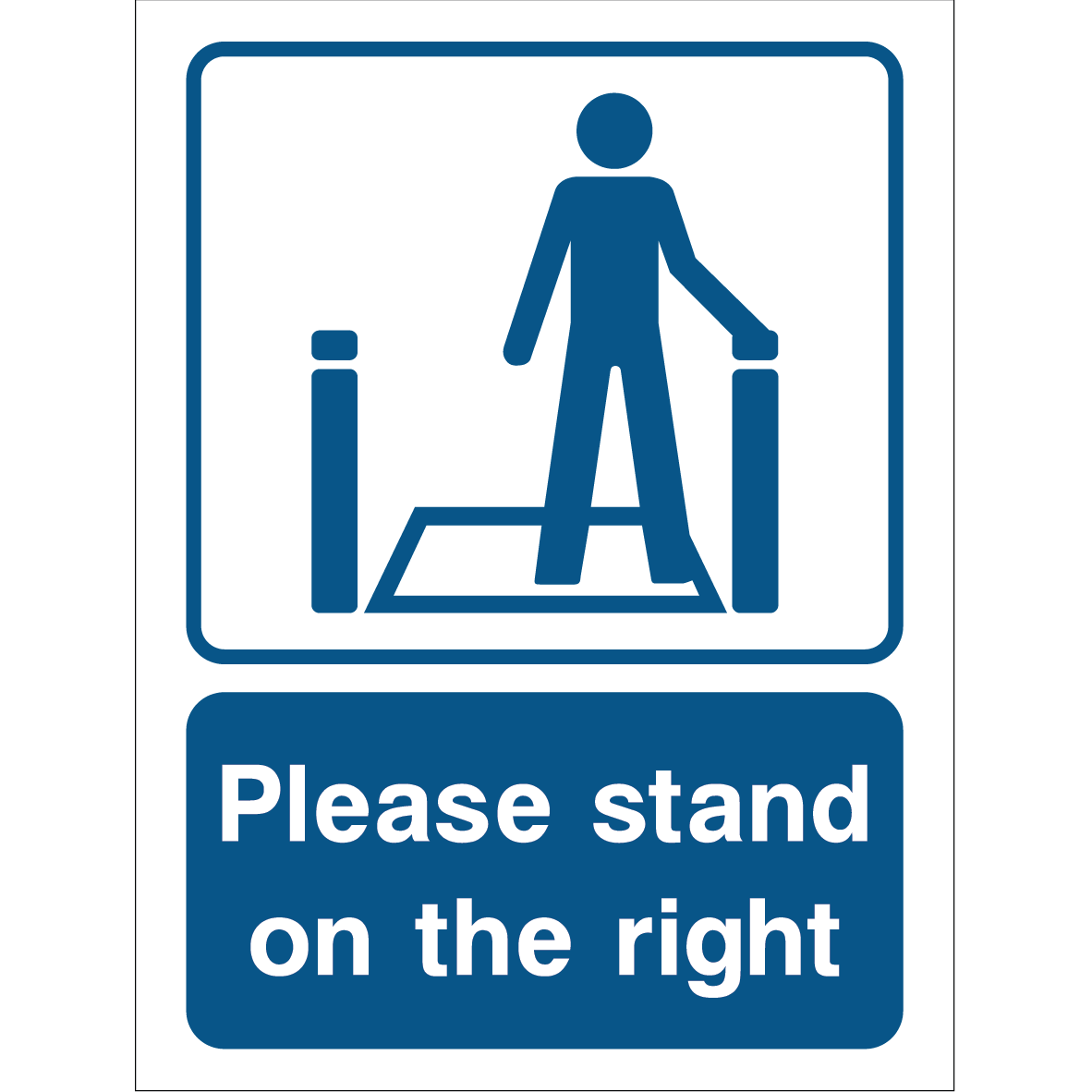 The “Please stand on the right” sign features a simple, universally recognisable blue background with a white pictogram of a person standing between two posts, indicating positioning. Beneath the pictogram, in a blue rectangular box with white text, it states: “Please stand on the right.” Made from durable, weather-resistant materials, this sign is suitable for indoor and outdoor settings such as walkways, escalators, or staircases. Its sturdy construction guarantees long-lasting performance even under harsh conditions. The clear message helps to organise pedestrian movement by encouraging people to stand on the right side, facilitating smooth flow and reducing congestion. Installing this sign improves safety, prevents accidents, and helps maintain orderly foot traffic. Its professional, straightforward design ensures high visibility and clarity.