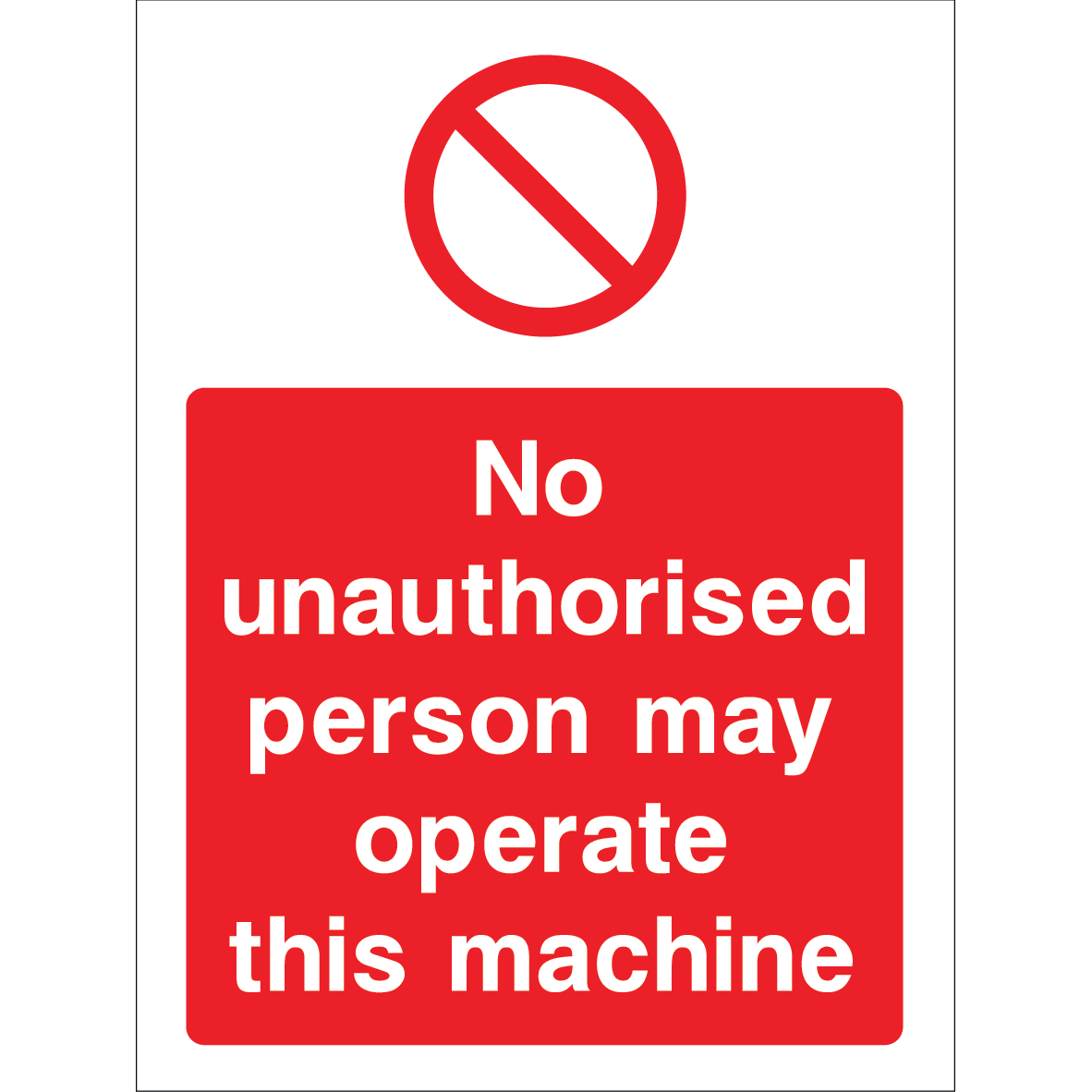 This “No Unauthorised Person May Operate This Machine” sign features a striking red background with large white text stating “No unauthorised person may operate this machine”. At the top, a universally recognised prohibition symbol (a red circle with a slash through it) visually reinforces the message, ensuring immediate recognition even from a distance.