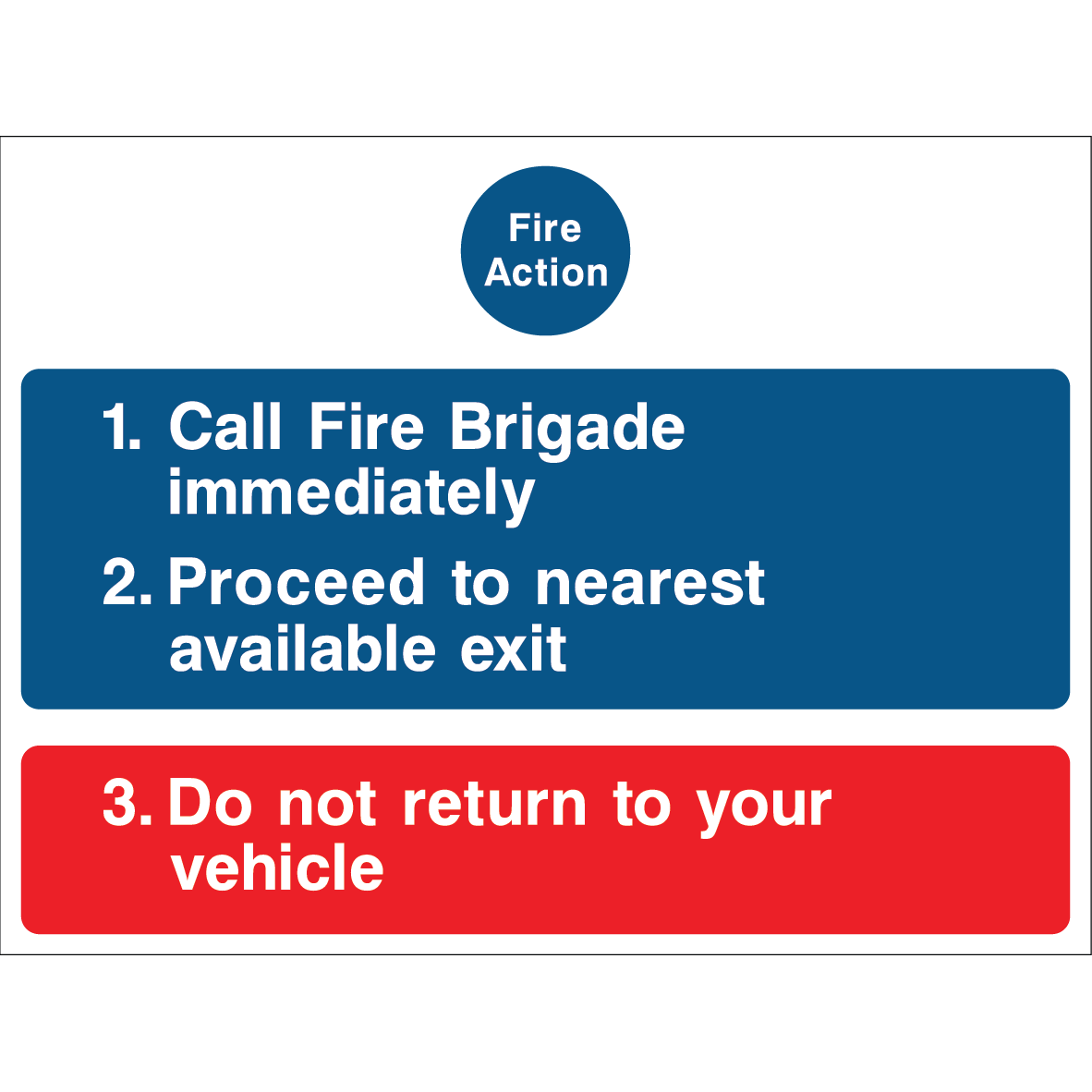 A professional fire safety sign displaying essential steps for emergency action, including calling the fire brigade, proceeding to the nearest exit, and not returning to your vehicle, designed to ensure safety during emergencies.