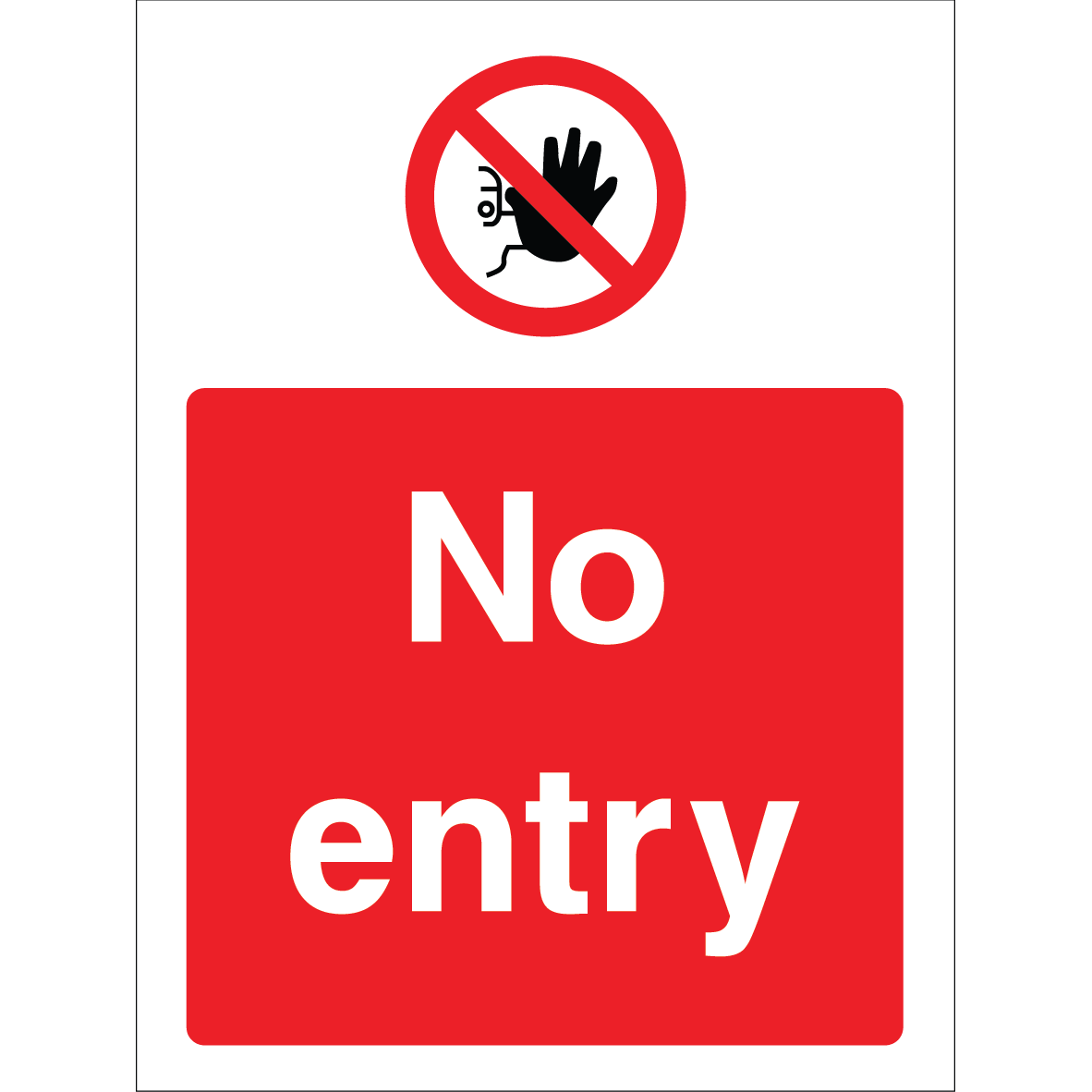 This “No Entry” sign combines a highly visible red background with bold white text, stating “No entry” in large, clear letters. At the top, a universally recognised no hand symbol within a red circle with a slash reinforces the message visually, making it immediately understandable even from a distance.