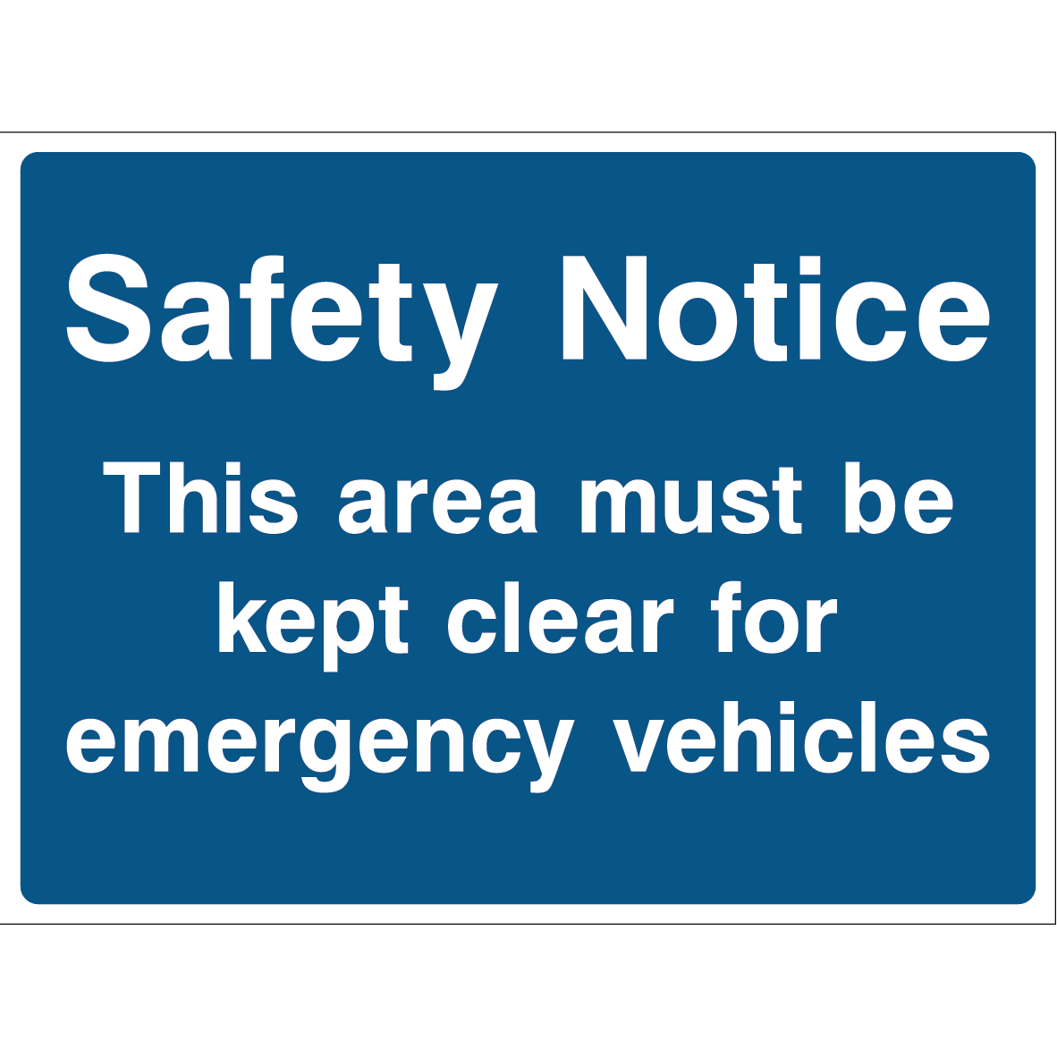 This “Safety Notice” sign features a prominent message in white text on a blue background, emphasising that the area must remain unobstructed for emergency vehicles.