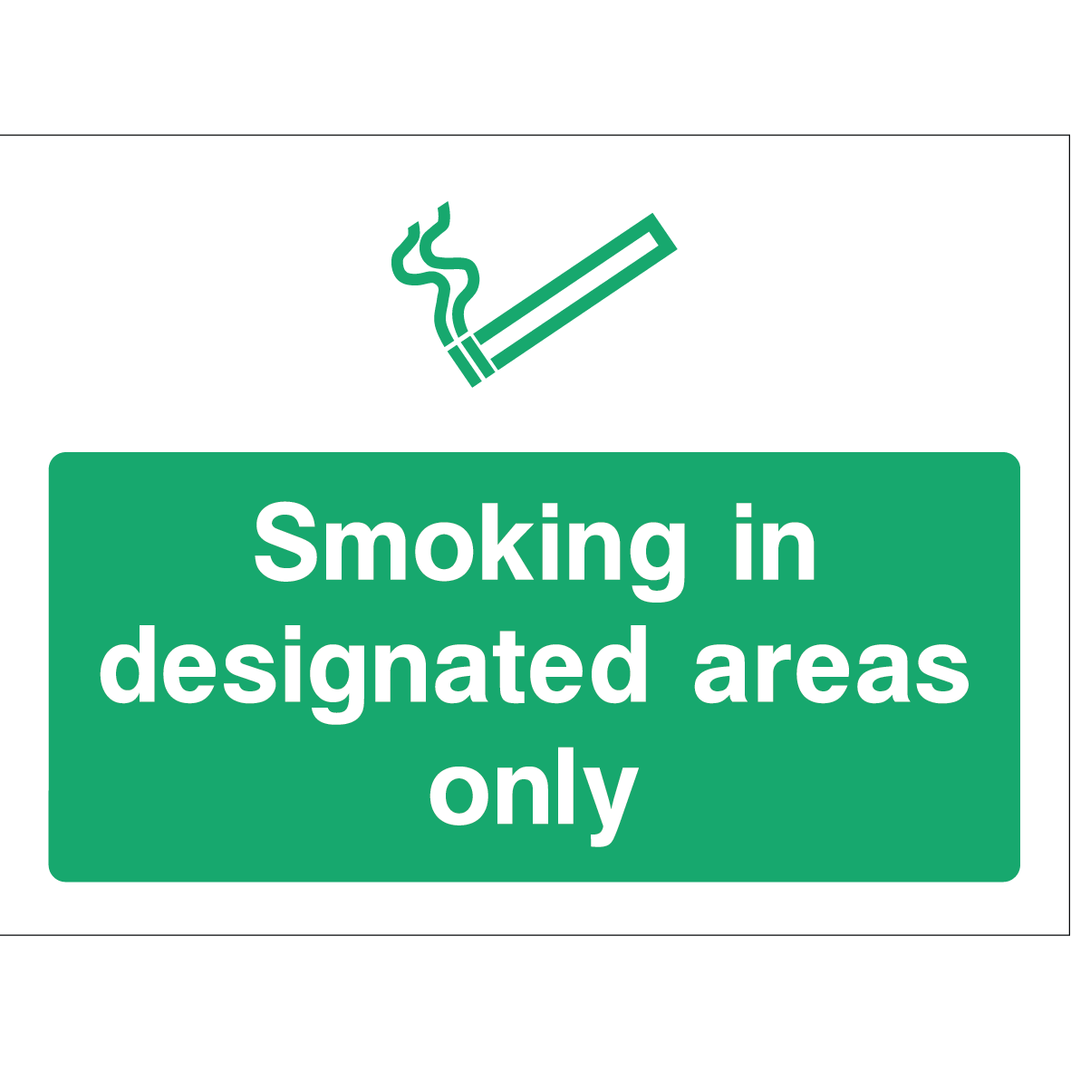 This “Smoking in designated areas only” sign features a simple, recognisable cigarette icon above the message, which reads “Smoking in designated areas only” in white text on a green background. It clearly indicates that smoking is permitted solely in specified zones, promoting safety and compliance.
