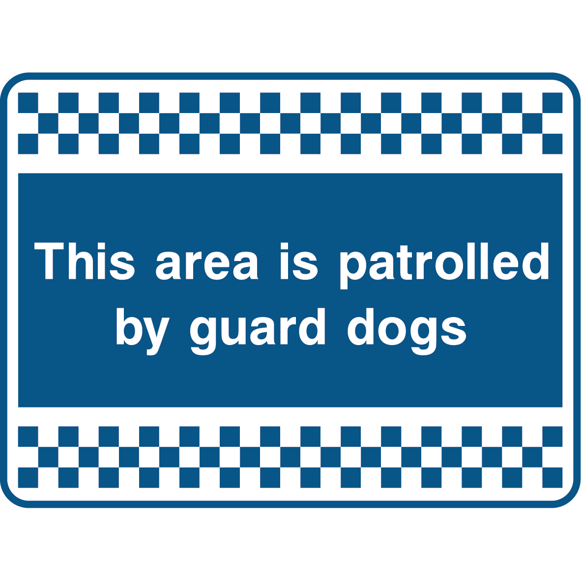 This “This area is patrolled by guard dogs” sign features a blue background with bold white text, framed by a checkered border. It acts as a clear deterrent warning that the premises are monitored by security dogs, supporting safety and security protocols.