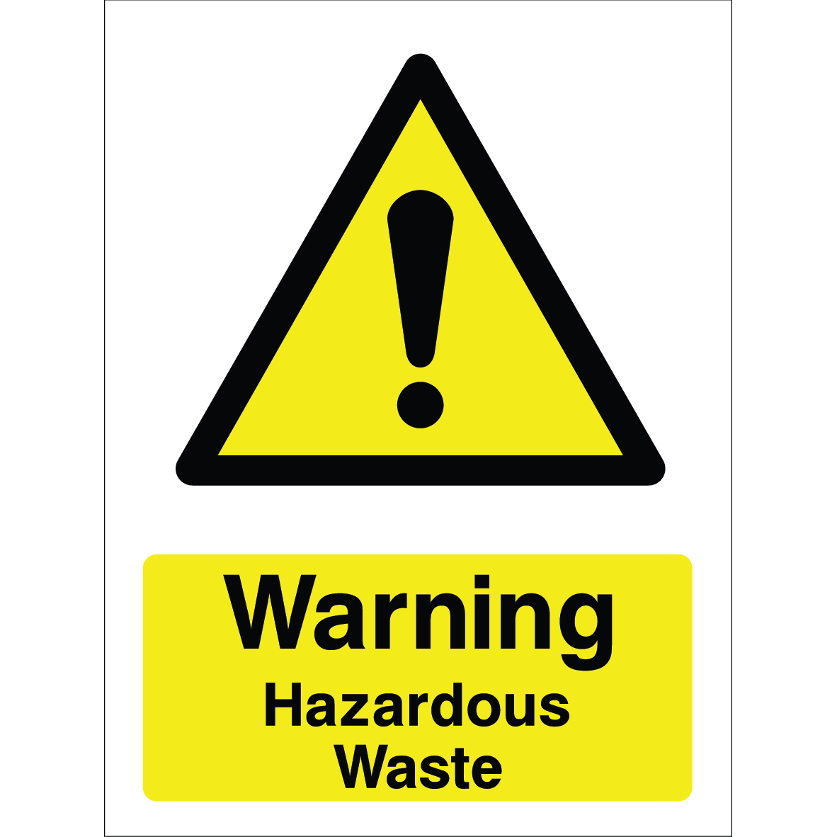 A yellow warning sign with a black triangle containing an exclamation mark, with the text: “Warning Hazardous Waste”.